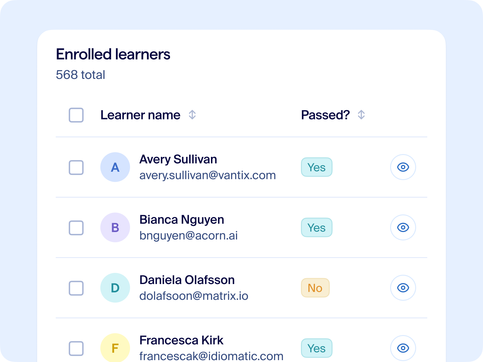Drill into each learner’s journey with timelines of attendance and watch time, quiz scores and attempts and certificates earned.